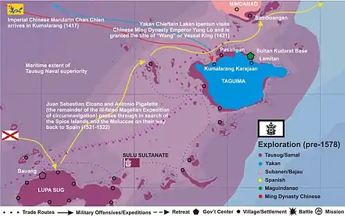 Chan Chien was received by Lakan Ipentun (Ch. ref. "Kanlai Ipentun"), presumably a Yakan Prince, who ruled the Kingdom as a vassal to the Sultan of Sulu. The Mandarin official stayed in Kumalarang for 2 years before returning to China.