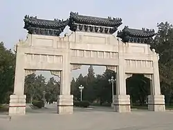 The Jin expanded the city to the west, east, and south, doubling its size. On today's map of urban Beijing, Zhongdu would extend from Xuanwumen in the northeast to the Beijing West railway station to the west, and south to beyond the southern 2nd Ring Road. The walled city had 13 gates, four in the north and three openings in each of the other sides. Remnants of Zhongdu city walls are preserved in Fengtai District.[64] The Jin emphasized the centrality of the regime by placing the walled palace complex near the center of Zhongdu. The palace was situated south of present-day Guang'anmen and north of the Grand View Garden.[65] In 1179, Emperor Zhangzong had a country retreat built northeast of Zhongdu. Taiye Lake was excavated along the Jinshui River[66] and Daning Palace (大寧宮/大宁宫) was erected on Qionghua Island in the lake.[67][Note 23] The grounds of this palace is now Beihai Park.