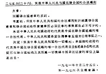 During that time, the Korean War broke out and U.S. troops moved into Taiwan,[111] while noting that Taiwan's status was undetermined.[112] As a result, the People's Republic of China complained to the United Nations Security Council Resolution 87 about the armed aggression against Taiwan, while protesting the exclusion of the People's Republic of China from the United Nations,[113] but the case was eventually rejected.[114] In the Treaty of San Francisco, Japan renounced all rights, rights names and claims to Taiwan and the Penghu Islands,[115] but neither the ROC nor the People's Republic of China participated in the signing of the peace treaty.[116] The ROC and Japan then signed the Treaty of Taipei in 1952, and the signing of the Sino-American Mutual Defense Treaty also made the PLA wary.[117] in April 1955, Zhou Enlai, Premier of the State Council and Ministry of Foreign Affairs of the People's Republic of China, went to Indonesia to attend the Bandung Conference and issued a statement that "the Chinese government is willing to negotiate with the U.S. government to strive for the liberation of Taiwan by peaceful means".[Notes 6] After learning of this in the U.S., Li Zongren responded by publishing "Proposals on the Taiwan Question" in August of the same year,[Notes 7] while the ROC government blocked the news of the publication of this article.[118]