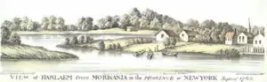 Though undeveloped, the area was not poor. Harlem was "a synonym for elegant living through a good part of the nineteenth century."[22] The village remained largely farmland estates, such as [Conrad] Van Keulen's Hook, orig. Otterspoor, bordered north of the Mill Creek (now 108th St., orig. Montagne Creek at 109th St.), which flowed into Harlem Lake, to the farm of Morris Randall, northwest on the Harlem River, and westward to the Peter Benson, or Mill Farm.[23]