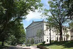 With the opening of the Kent Free Library in 1892, Kent became the first municipality in Ohio to take advantage of a new state law which allowed municipalities with populations under 5,000 to tax residents for the upkeep of a library.[27] In 1903, the library moved to its current location on West Main Street in a building that was financed by a $10,000 USD ($325,720 present-day) gift from Andrew Carnegie. Carnegie donated the money on the condition residents provided a site and $1,000 USD ($32,572 present-day) per year for maintenance. The levy passed overwhelmingly[28] on September 17, 1901 and the site was donated by Marvin Kent. Although additions have been made throughout the years, the original library building still stands today and currently houses the library's genealogy and local history areas. Most recently, all previous additions were demolished and a new, three-story addition was constructed which tripled the previous amount of available space. This new addition opened on September 26, 2006, exactly 103 years after the original library opened.[29]