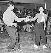 In March 1985, the Jiving Lindy Hoppers (Warren Heyes, Terry Monaghan, Ryan Francois, Claudia Gintersdorfer, and Lesley Owen) travelled to New York City on their first research visit. Their goal was primarily to meet Al Minns but when they arrived, they learned that he was in hospital and not expected to live much longer. (Al Minns died on 24 April 1985.) Through Mama Lou Parks, they met Alfred "Pepsi" Bethel and trained with him for two weeks in New York City followed by another week in London.[15] While in NY, they also met two former members of Whitey's Lindy Hoppers, Frankie Manning and Norma Miller, dance historians Mura Dehn, Sally Sommer, and Ernie Smith, as well as dance enthusiasts that had just formed the New York Swing Dance Society in 1985.[18][19] During the 1980s, the Jiving Lindy Hoppers were instrumental in spreading Lindy Hop throughout the UK by teaching and performing at shows, festivals and on TV. In January 1984, the Jiving Lindy Hoppers started teaching Lindy Hop in London. After the first few classes, Ryan Francois joined the classes and later that year became a member of the Jiving Lindy Hoppers.[18] During the 1990s, he was considered one of the most talented modern Lindy Hoppers and travelled internationally to teach and perform the Lindy Hop with his dance company, Zoots and Spangles Authentic Jazz Dance Company (formed in 1986) formed with two other dancers who also left The Jiving Lindyhoppers troupe to form Zoots and Spangles. On 31 October 1987, Simon Erland, a sculptor and dance enthusiast, started Jitterbugs London with Ryan Francoise, the first European Lindy Hop and Swing club to run weekly events with classes that began the social Lindyhop revival. Ryan's troupe Zoots and Spangles were an integral part of the club and performed there regularly as well as in stage shows which grew the popular awareness of the dance. Jitterbugs and Zoots were the real catalyst for the Lindyhop revival in the 1980s and 1990s.[20] Ryan Francois and Julie Oram taught Lindy Hop classes followed by DJed music from the 1930s, 1940s and 1950s. Sing Lim, "an extra enthusiastic and energetic dancer",[20] became good friends with Ryan and Julie and in 1991, she started to help run Jitterbugs. Sing Lim taught the dance classes when Ryan and Julie were out of town performing for Zoots and Spangles, as well as helped advertise and promote the club.[20][21] When Sing Lim returned to Singapore in 1994, she started Jitterbugs Swingapore and helped spread Lindy Hop to Singapore, Australia, and Japan, as well as parts of the U.S.