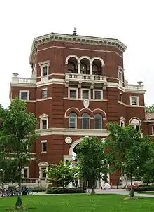 In 1858, what would become Oregon State University began as Corvallis College as it was formally incorporated by members of the Freemasons.[1][5][6] At that time the school did not offer college level courses. Years later the school's ownership was transferred to the Methodist Episcopal Church.[1] In 1865, William A. Finley was named as the school's first president.[1] The school as began offering a bachelor's degree that year.[1]