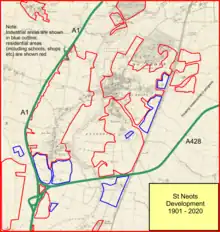 St Neots has been designated for a considerable expansion of housing in the twenty-first century. As well as local in-fill sites, this involved the Loves Farm development in 2006. That development is currently (2021) being extended eastward, and the first stage of the Wintringham Estate, between Cambridge Street and the St Neots by-pass, has been constructed.