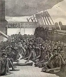 On top of the fear of disease, people were afraid of why they were being captured. The popular assumption was that Europeans were cannibals. Stories and rumours spread that whites captured Africans to eat them.[64] Olaudah Equiano accounts his experience about the sorrow enslaved people encountered at the ports. He talks about his first moment on a slave ship and asked if he was going to be eaten.[65] Yet, the worst for slaves has only begun, and the journey on the water proved to be more harrowing. For every 100 Africans captured, only 64 would reach the coast, and only about 50 would reach the New World.[64]