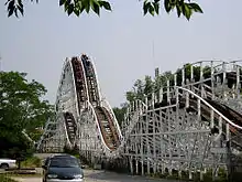 By 1919, the first underfriction roller coaster had been developed by John Miller.[11] Soon, roller coasters spread to amusement parks all around the world. Perhaps the best known historical roller coaster, The Cyclone, was opened at Coney Island in 1927. Like The Cyclone, all early roller coasters were made of wood. Many old wooden roller coasters are still operational, at parks such as Kennywood near Pittsburgh, Pennsylvania and Pleasure Beach Blackpool. The oldest operating roller coaster is Leap-The-Dips at Lakemont Park in Pennsylvania, a side friction roller coaster built in 1902. The oldest wooden roller coaster in the United Kingdom is the Scenic Railway at Dreamland Amusement Park in Margate, Kent and features a system where the brakeman rides the car with wheels. It was severely damaged by fire on April 7, 2008, but was subsequently restored and reopened to the public in 2015.[12] Scenic Railway at Melbourne's Luna Park built in 1912, is the world's oldest continually-operating roller coaster, and it also still features a system where the brakeman rides the car with wheels. One of only 13 remaining examples of John Miller's work worldwide is the wooden roller coaster at Lagoon in Utah. The coaster opened in 1921 and is the 6th oldest coaster in the world.[13]
