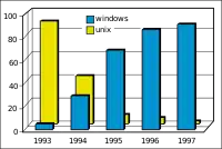 This is a table of personal computer web browsers by year of release of major version. The increased growth of the Internet in the 1990s and 2000s means that current browsers with small market shares have more total users than the entire market early on. For example, 90% market share in 1997 would be roughly 60 million users, but by the start of 2007 9% market share would equate to over 90 million users.[43]