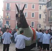 The Santa Tecla Festival takes place at Tarragona from 15 to 24 September and includes the saint's day, 23 September.[49] A number of animals, real and mythical, are impersonated in the parades that form a major part of the festivities. Among them is a larger-than-life Mulassa (mule) carried by two dancers who are hidden under its skirts, apart from their legs.