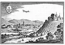 In the middle of the 13th century the castle passed into the possession of the Counts of Hohenberg. Thereafter, one branch of this family called itself Counts of Nagold and had the castle transformed into their residence in the 13th and 14th century. In 1364 the sold the castle to the Counts of Württemberg. The new owners added bastions and towers to the outer ward and had the castle occupied by their ministeriales. Towards the end of the Thirty Years' War, the castle was conquered by Bavarian troops in 1645 and severely damaged. In 1646 the remnants of the castle were pulled down.[2]