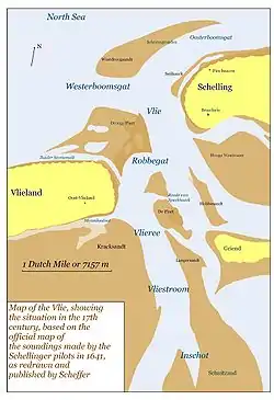 The shoals, at this point even more dangerous than usual at the Dutch coast, were generally considered sufficient protection against any enemy attack. However, the English had the advantage of being aided by a Dutch captain, Laurens Heemskerck, known to the English as "Lauris van Hamskirck", who had fled from the Netherlands in 1665 on account of the cowardice he had shown during the Battle of Lowestoft and was afterwards condemned in absentia to perpetual banishment. Heemskerck in 1666 suggested executing a raid on the Vlie and later, in 1672, fought on the French side against his countrymen at the Battle of Solebay.[3] On the 7th Heemskerck was sent out on Little Mary, a sixth-rate vessel of 12 cannon, to reconnoitre the coast together with Rupert's private yacht Fan Fan, returning the evening of the next day. A sweep along the coast by a frigate squadron during the following week brought only few prizes. When the English fleet, sailing along the Dutch coast from the south, anchored in front of the Texel on 16 August, during a council of war Heemskerck convinced Rupert and Monck that an attack was feasible as "(...) the islands of Vlie and Schelling were very ill guarded, notwithstanding there were Store-houses both for the States, and the East-India Fleet, and Riches to a good value".[4]