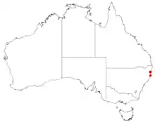 This species is endemic to the Glenreagh district of north-eastern New South Wales, where it grows on shallow rocky soils derived from sandstone in shrubby woodland.[3]