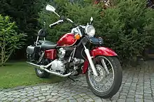 46. "Those Marvelous Middleweights". Motorcycle Cruiser. Bonnier Corporation (published December 2001). 24 February 2009. Retrieved 1 November 2018. The Spirit brings new styling cues including chopped fenders, a skinny 100/80-19 front tire on a wire-spoke wheel, an uncovered fork crowned with a small headlight, a lower and narrower handlebar, a leaner-looking 3.6-gallon fuel tank, a trimmer one-piece saddle that helps lower saddle height by an inch to 26.6 inches, exposed-spring rear shocks and a squat 160/80-15 rear tire.