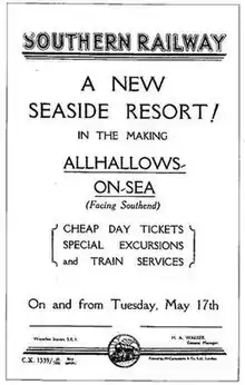 On 14 May 1932 a branch railway was opened to the Thames estuary beyond the ancient village of Allhallows. It was intended to become a riverside resort of some size, and grandiose plans were formed. The new area was given the name of Allhallows-on-Sea. Little came of the scheme, and today all signs of that branch have disappeared, save for the water tower which supplied locomotives at the terminus – it is now a listed building. There is a holiday village on the site where the resort was intended to be.[12]