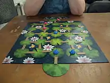 Hooop! is a game about frogs hopping on lily pads in a pond. Each player receives three frogs of a specific colour. The board consists of 25 lily pads arranged in a 5×5 rectangular grid. Each player's frogs start from the player's own base at their edge, and the object of the game is to get all three frogs to the bases on the edges belonging to the other players.
