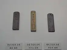 Hopae were identification tags carried by Koreans during the Joseon dynasty, recording the bearer's name, place of birth, status and residence.[1] The tags consists of the persons name, birthdate, and where they were born. The hopae system helped the government in tax collection and retrieving runaway slaves.[2]