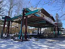 House raising (house lifting, house jacking, barn jacking, building jacking) is the process of separating a building from its foundation and temporarily raising it with hydraulic screw jacks. The process is the first step in structure relocation in which the building is moved to a different location.[1][2] House raising may also be a part of a renovation to build a foundation under an existing house or make a house larger by building a new floor level creating a two-story house. Often employed in areas that are prone to flooding and storm damage, this process can be achieved through the use of either timber piles or helical piles.[3] Once a house is raised and supported on cribbing, a new foundation can be constructed beneath it.[4] After Hurricane Katrina and Hurricane Sandy large numbers of houses in parts of Louisiana, New York and New Jersey were raised to avoid future flooding.