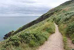 Howth is also a destination for cyclists, joggers and hill-walkers alike, particularly on weekends. One attraction is the six-kilometre long Cliff Path Loop.[40] The loop walk takes about two hours to complete, is rated with an easy to moderate difficulty, and begins and ends at the Howth DART [Railway] Station. Another common walk is the original Cliff Walk to Red Rock in Sutton.
