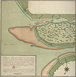 Lapérouse then collected most of the company's small boats and on 11 August sailed for York Factory, a trading outpost on a peninsula between the Hayes and Nelson River.[18][19] According to Lapérouse's report, he arrived in the area, about 5 leagues (15 miles; 24 km) from York, on August 20.[18] The fort's defenses faced the Hayes River, where the company ship King George was anchored, and the fast-flowing Hayes River would have made an approach there impractical in the face of such potential opposition.[20]