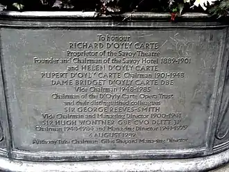 Carte died in 1948, and as his heir, Bridget D'Oyly Carte, did not wish to become chairman,[3] the Savoy board elected Wontner, the first person to combine the roles of chairman and managing director since the Savoy's founder, Richard D'Oyly Carte.[2] Wontner remained managing director until 1979 and chairman until 1984. He was elected life president of the group in 1990.[1]