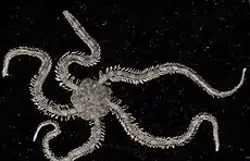 Pteropods and brittle stars together form the base of the Arctic food webs and both are seriously damaged by acidification. Pteropods shells dissolve with increasing acidification and brittle stars lose muscle mass when re-growing appendages.[114] Additionally the brittle star's eggs die within a few days when exposed to expected conditions resulting from Arctic acidification.[115] Acidification threatens to destroy Arctic food webs from the base up. Arctic waters are changing rapidly and are advanced in the process of becoming undersaturated with aragonite.[107] Arctic food webs are considered simple, meaning there are few steps in the food chain from small organisms to larger predators. For example, pteropods are "a key prey item of a number of higher predators – larger plankton, fish, seabirds, whales".[116]