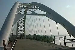 The bridge is constructed of two 1,200 millimetres (47 in) diameter high-strength steel pipes, bent into twin arches that rise 21.3 metres (70 ft) above grade, and suspend the deck by way of 44 stainless-steel hangers, each 50 millimetres (2.0 in) in diameter. The foundation consists of concrete-filled caissons which go down 30 metres (98 ft) below grade to the bedrock.[1]