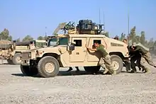 The armor kits fielded include the Armor Survivability Kit (ASK), FRAG 5, FRAG 6, as well as upgrade kits to the M1151.[24][25] The ASK was the first fielded in October 2003, adding about 1,000 pounds (450 kg) to the weight of the vehicle.[26] Armor Holdings fielded an even lighter kit, adding only 750 pounds (340 kg) to the vehicle's weight.[27] The Marine Armor Kit (MAK), fielded in January 2005, offers more protection than the M1114 but also increases weight. The FRAG 5 offered even more protection but was still inadequate to stop EFP attacks.[28] The FRAG 6 kit is designed to do just that, however its increased protection adds over 1,000 lb (450 kg) the vehicle over the FRAG 5 kit, and the width is increased by 2 feet (61 cm). The doors may also require a mechanical assist device to open and close.[29]