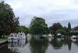 There are several weirs between the islands but the main weir is upstream between the topmost island and the Buckinghamshire bank. The weir is popular with kayakers whenever conditions are favourable, and it is very busy at weekends.