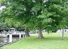There was a Flash lock in the weir here, referred to in the 16th and 17th century as "New Lock". The pound lock was opened in 1773, being the fifth downstream of the eight original locks built after the 1770 navigation act. It was constructed of fir wood, and like the other locks, where the fir was subsequently replaced by oak, it was in decay and in need of repair in 1780 and 1785. On the latter occasion the owner of the flash lock was instructed to keep the flash lock in good repair for use by barges. Further repair was made in 1791, and in 1910 it still had timber sides.[2] It has since been replaced by masonry.