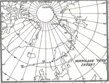 At 00:00 UTC on August 29, Faith attained its maximum sustained winds of 125 mph (201 km/h).[2] After reaching maximum sustained winds late on August 29, Faith began to gradually weaken and decreased to Category 2 hurricane intensity early on August 30.[2] By that time, the storm turned to the northeast around the periphery of an Atlantic subtropical anticyclone while located about midway between Bermuda and Florida.[1][4] Faith remained well offshore of the East Coast of the United States and Atlantic Canada, after veering eastward on September 1.[2] Thereafter, it began to accelerate and eventually curved northeastward.[1] While approaching Europe, Faith's forward speed increased to as much as 50 mph (80 km/h). At 0600 UTC on September 3, a minimum barometric pressure of 950 mbar (28 inHg) was recorded – the lowest in relation to the storm. After remaining a Category 2 hurricane since August 29, Faith weakened slightly to a Category 1 hurricane early on September 6, as it neared the Faroe Islands.[2] Crossing the North Sea, Faith finally transitioned into an extratropical storm at 1200 UTC later that day, while centered about 125 miles (201 km) east-northeast of Tórshavn.[2][1][5] The extratropical remnants of Faith headed eastward and affected Norway with winds as high as 60 mph (97 km/h).[2] Tracking over Scandinavia, the extratropical storm weakened to the equivalent of a tropical depression before entering the Soviet Union (present day Russia). Eventually, the storm degenerated into an extratropical low pressure area, curved northward, and retained its identity until September 15,[6] when it was over Franz Josef Land, which is roughly 600 miles (970 km) from the North Pole.[5]