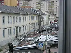 In Portugal, coastal regions were put under a yellow alert, the second lowest level, since the extratropical remnants of Gordon were expected to produce rough seas and heavy rains.[25] In Spain, the Galicia region was placed on red alert by authorities in anticipation of the storm. Classes on September 21 were also suspended by the regional education ministry. Eleven other regions of Spain, extending as far east as Madrid and as far south as Andalusia, received lower levels of warning.[26] The storm's threat also prompted the cancellation or delay of flights along the coast.[27] While passing northwest of Spain, the remnants of Gordon produced strong wind gusts, reaching 183 km/h (114 mph) at Punta Candieira in Galicia on the country's northwest coast. The nearby city of A Coruña recorded sustained winds of 43 mph (69 km/h),[1] while further inland, a station near Madrid reported winds of 107 km/h (66 mph). Along the coast, waves reached 7 m (23 ft) in height, while rainbands dropped heavy precipitation, including a total of 65.5 mm (2.58 in) in Canfranc.[28] Wind-blown debris injured four people in the country,[1] and a fifth storm-related injury occurred as the result of a tree falling onto an occupied vehicle. The winds downed trees, traffic lights, and power lines,[27] leaving about 100,000 people without power.[1][27] Throughout Galicia, total monetary losses reached €3 million (US$3.8 million; 2006 USD).[29]