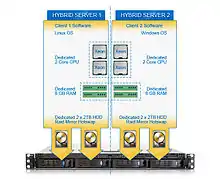 The server is separated into hybrid server environments using Red Hat KVM or any other virtualization. Each hybrid environment is securely isolated and has guaranteed resources available to it which ensures a high level of performance and responsiveness. A hybrid server combines all of the benefits of virtualization technology with the performance of a full dedicated server. So, an administrator can use automation to suspend, restart, or reinstall the operating system. One large server is split into a few (normally two) Hybrid servers. The benefits of this platform also include access through a single point of contact; sharing the network infrastructure; and monitoring, delivering, and managing hosting services.[2]