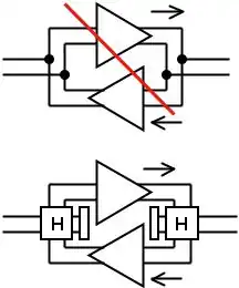 The primary use of a voiceband hybrid transformer is to convert between 2-wire and 4-wire operation in sequential sections of a communications circuit, for example in a four-wire terminating set. Such conversion was necessary when repeaters were introduced in a 2-wire circuit, a frequent practice at early 20th century telephony. Without hybrids, the output of one amplifier feeds directly into the input of the other, resulting in uncontrollable feedback oscillation (upper diagram). By using hybrids, the outputs and inputs are isolated, resulting in correct 2-wire repeater operation. Late in the century, this practice became rare but hybrids continued in use in line cards.