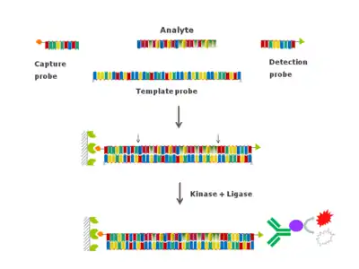 In the hybridization-ligation assay[4][5] a template probe replaces the capture probe in the sandwich assay for immobilization to the solid support. The template probe is fully complementary to the oligonucleotide analyte and is intended to serve as a substrate for T4 DNA ligase-mediated ligation. The template probe has in addition an additional stretch complementary to a ligation probe so that the ligation probe will ligate onto the 3'-end of the analyte. Albeit generic, the ligation probe is similar to a detection probe in that it is labelled with, for example, digoxigenin for downstream signalling. Stringent, low/no salt wash will remove un-ligated products.