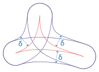 The hyperbolic plane is hyperbolic: in fact the incircle of a geodesic triangle is the circle of largest diameter contained in the triangle and every geodesic triangle lies in the interior of an ideal triangle, all of which are isometric with incircles of diameter 2 log 3.[6] Note that in this case the Gromov product also has a simple interpretation in terms of the incircle of a geodesic triangle. In fact the quantity (A,B)C is just the hyperbolic distance p from C to either of the points of contact of the incircle with the adjacent sides: for from the diagram c = (a – p) + (b – p), so that p = (a + b – c)/2 = (A,B)C.[7]