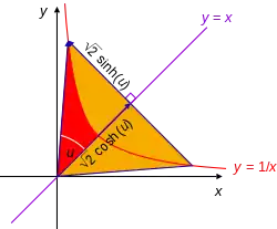 The analogy between circular and hyperbolic functions was described by Augustus De Morgan in his Trigonometry and Double Algebra (1849).[2] William Burnside used such triangles, projecting from a point on the hyperbola xy = 1 onto the main diagonal, in his article "Note on the addition theorem for hyperbolic functions".[3]