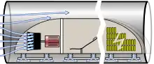 A hyperloop is a proposed high-speed transportation system for both public and goods transport. The idea was picked up by Elon Musk to describe a modern project based on the vactrain concept (first appearance in 1799).[1] Hyperloop systems have three essential elements: tubes, pods, and terminals. The tube is a large, sealed low-pressure system (usually a long tunnel). The pod is a coach pressurized at atmospheric pressure that runs substantially free of air resistance or friction inside this tube[2] using magnetic propulsion (in some cases augmented by a ducted fan). The terminal handles pod arrivals and departures. The Hyperloop, in the initial form proposed by Musk, differs from vactrains by relying on residual air pressure inside the tube to provide lift by aerofoils and propulsion by fans.[3]