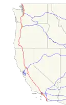 The route suggested in the 2013 alpha-level design document was from the Greater Los Angeles Area to the San Francisco Bay Area. That conceptual system would begin around Sylmar, just south of the Tejon Pass, follow Interstate 5 to the north, and arrive near Hayward on the east side of San Francisco Bay. Several proposed branches were also shown in the design document, including Sacramento, Anaheim, San Diego, and Las Vegas.[3]