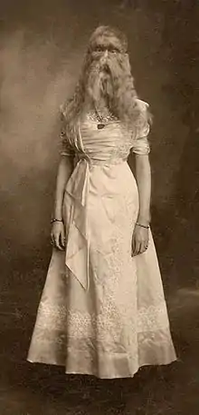 Julia Pastrana (1834–1860)[6] travelled throughout the United States in a freak show as the bearded lady, capturing the attention of many artists.[6] She is portrayed as having dark extensive hairs distributed equally throughout the surface of her body, even on the palms of her hands.[6] Originally, she was believed to have congenital hypertrichosis lanuginosa; however, the generalized form of the syndrome coupled with her gingival hyperplasia indicated that her condition was congenital terminal hypertrichosis.[6][8] This was not confirmed until after her death, when it became clear that her X-linked syndrome resulted in terminal hairs.[8]