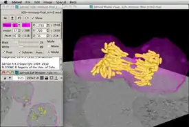 IMOD is an open-source, cross-platform suite of modeling, display and image processing programs used for 3D reconstruction and modeling of microscopy images with a special emphasis on electron microscopy data. IMOD has been used across a range of scales from macromolecule structures[1] to organelles[2][3][4] to whole cells[5] and can also be used for optical sections.[6][7] IMOD includes tools for image reconstruction, image segmentation, 3D mesh modeling and analysis of 2D and 3D data.