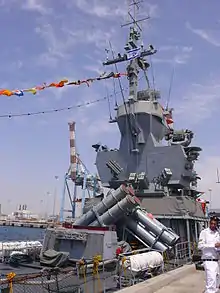 The primary armament is two quadruple launchers of American Harpoon anti-ship missiles, allocated directly behind the superstructure.[1][4] The missile is able to reach 130 km (81 mi), the speed is Mach 0.9 (1,100 km/h; 690 mph), the warhead weighs 227 kg (500 lb).[1][2] To the aft of these launchers, six single launchers of Israeli Gabriel Mark II missiles are allocated,[1][4] with a 75 kg (165 lb) warhead and a range of about 36 km (22 mi).[1][2] There are also two deck-mounted 8-fold anti-aircraft Barak 1 launchers with the range of 10 km (6.2 mi).[1][2]