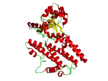 The mouse genome encodes 23 IRGs, several of which have been demonstrated to be widely expressed (liver, heart, spleen, intestine, thymus, lung, testis, kidney, brain, skin) in a number of cell types,[9] and are greatly up-regulated following exposure to the potent immune effector molecule interferon gamma, IFNγ.[10] IRGs are subdivided into two additional classes based on the mode of activity and mechanism. The GSK class (Irga6, Irgb6, and Irgd) are considered the canonical grouping of GTPases, whereas a second grouping of GMS proteins, which have a lysine to methionine mutation in the active site, function to prevent premature activation by associating with the nucleotide binding motif in a manner similar to Guanosine nucleotide dissociation inhibitors (GDI's).[11][12] The subcellular localization of IRGs are variable; Irga6 and Irgm3 are predominantly found within the endoplasmic reticulum, Irgm1 and Irgm2 have been localized to the Golgi apparatus,[13] and at least two IRGs (Irgb6 and Irgd) have been found predominantly within the cytosol.[14] Following cellular entry of Toxoplasma gondii, IRGs can quickly redistribute onto the parasitophorous vacuole membrane (PVM) within 2–30 minutes.[12] The approximate order of decorating the PVM has been defined starting with the loading of Irgb6 and Irgb10 followed by Irga6, Irgd and Irgm2. Faint localization of Irgm3 on T. gondii vacuoles was also reported to occur in rare settings. Activation of the IRGs is thought to follow a GTP dependent cycle of IRG-IRG oligomerization.[15] The loading of the "pioneer" IRGs onto the vacuole is thought to greatly enhance the recruitment of additional IRGs in a cooperative fashion.