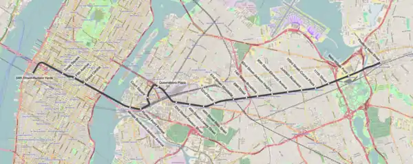 The line has two distinct sections, split by the Queensboro Plaza station. It begins as a three-track subway, with the center track used for express service, at Flushing–Main Street.[4] It quickly leaves the ground onto a steel elevated structure above Roosevelt Avenue, passing Citi Field and the United States Tennis Association's National Tennis Center. A flying junction between Mets–Willets Point and 111th Street provides access to the Corona Yard from the local tracks.[5] At 48th Street in Sunnyside, the line switches to Queens Boulevard and an ornate concrete viaduct begins. The express track ends between 33rd Street–Rawson Street and Queensboro Plaza.[4][6]