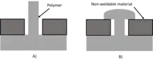IR staking includes the localized welding of a thermoplastic stud or stake from one part into the cavity of a non-weldable part to form a mechanical fastener. As shown in the figure to the right, the polymer part and non-weldable part are first placed together (A), then the projecting polymer is melted and formed around the non-weldable part to fasten the two together (B). The stud can be heated through directed TTIr when pre-placed within the cavity of an IR transparent part, then melted to deform it into a button shape required to fill the cavity before solidifying. Surface IR radiation can also be used to soften a plastic stud which is then pressed into a button-shaped die to form a head before cooling and solidifying.[1]