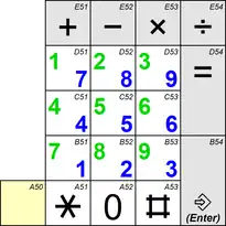 • at least 12 keys in row E (the upmost row) in positions E00 to E15, containing all keys to input the decimal digits,