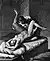 - Or, more precisely, woman partly lying, partly supported by bed, and partly supported on left arm.