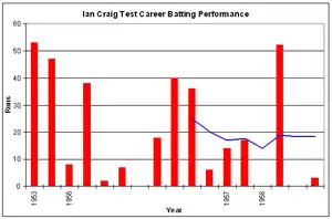 Craig's tour started poorly, and food poisoning hampered him until after the Second Test—one particular severe bout forced him to be hospitalised.[26][31] In his first six first-class matches, Craig made only 104 runs at 17.33.[11] His tour began to improve in late June,[11] when he made consecutive half-centuries against Yorkshire and Gloucestershire before breaking through in a match against Somerset.[11] He was dropped before going on to score 62 and 100 not out—his first century in 38 innings in England.[31] He was selected for the Fourth Test at Old Trafford,[20] after Australia had suffered a heavy defeat at Headingley in the Third Test at the hands of the Surrey spin pairing of Jim Laker and Tony Lock, Australia's first innings defeat in 18 years.[19] The Fourth Test was to be known as Laker's Test, in which Laker took a record 19 wickets in the match. Laker trapped Craig leg before wicket for eight in the first innings as Australia were bowled out for 84.[39] In the second innings, Craig came out to bat at 1/28 in the second innings on a sticky wicket and combined in a defiant third-wicket partnership of 59 with Colin McDonald.[39] He battled for over four hours in compiling 38 before being dismissed by Laker.[1][7][39][40] Reflecting on the match, Craig said "Jim bowled well, and we batted very badly. We were all pissed off, felt we'd been dudded and we dropped our bundle a bit."[40] His stubborn display saw him retain his position for the Fifth Test at The Oval when he scored two and seven.[20][26] Craig ended the season with 872 runs at 36.33 from 20 matches, with one century and five fifties,[11] the fifth highest aggregate for the Australians.[41]
