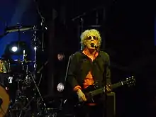 By 1969, Hunter had two children, but was still hoping for a return to making music full-time. Meanwhile, guitarist Mick Ralphs joined organist Verden Allen in Jimmy Cliff's backing band, The Shakedown Sound. Eventually Ralphs, Allen, vocalist Stan Tippins, bassist Overend Watts, and drummer Dale Griffin united to become Silence, who auditioned for British impresario Guy Stevens. Silence renamed themselves after Willard Manus' 1966 novel, Mott the Hoople.[16] The band lacked a credible singer with stage presence, and the seasoned Hunter, who had by this time taken to wearing his trademark sunglasses, auditioned on a lark and was given the position. They were a critical success in the UK, where some of their most dedicated early fans included future members of the Clash.[17] However, they could not sustain their commercial appeal, and their American tours were slow in building a following. Mott released several LPs and attracted enthusiastic live audiences, but experienced dismal sales despite the svengali-like leadership and promotion of Stevens.[18] After a 1972 concert in a "gas cylinder" in Switzerland, the band announced their end.