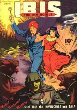 The original Ibis first appeared in Whiz Comics #2 (February 1940), and was created by Bob Kingett.[1] When superheroes declined in popularity in the early 1950s, Ibis and the other Fawcett characters ceased publication. One Ibis story shortly thereafter was reprinted by Charlton Comics.[2] The Fawcett characters were later licensed and eventually bought outright by DC Comics in the 1970s. The second Ibis first appeared in Helmet of Fate: Ibis the Invincible #1 (January 2007), and was created by Tad Williams and Phil Winslade.