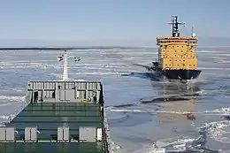 Ice navigation occurs wherever a waterborne vessel transits through sea ice. One of the more common regions for ice navigation is the Baltic Sea, where vessels visiting the Baltic States will make their way through first year ice in the winter months, often with an icebreaker, or with ice reports, charts and data provided by meteorological offices.[4][5] Other areas include the Arctic Ocean, where increasing numbers of ships are transiting the region in the summer months for cruising and to transport cargo, as a result of oil and gas extraction in areas such as Yamal.[6] The problems of increased shipping in polar regions presents additional challenges, including maritime safety concerns in the event that ice navigation is not carried out carefully.[6] Ships will also pass through ice when navigating in the Antarctic, although most ships are either research vessels or cruise ships that have been especially ice strengthened. Other significant maritime regions where ships will navigate through Ice include the Saint Lawrence Seaway, around Greenland and the Canadian coast, the North Atlantic during iceberg season and through the Northwest Passage.[7]