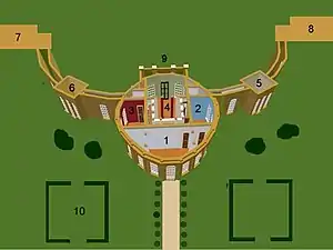 Unlike the design of a true Palladian building, the terminating pavilions, rather than minor balancing appendages, are in fact large wings, complementary in weight to the rotunda which becomes their corps de logis. The East Wing, a small mansion in itself, was designed to be the everyday living quarters of the family (which it remained until 1998), thus permitting the more formal rooms of the rotunda to be reserved for entertaining and display. The west wing, intended as an orangery, sculpture gallery and service rooms remained an unfinished shell until the beginning of the 21st century. For much of the time it was used as agricultural storage and latterly for playing squash on a court installed by the 4th Marquess.[4]